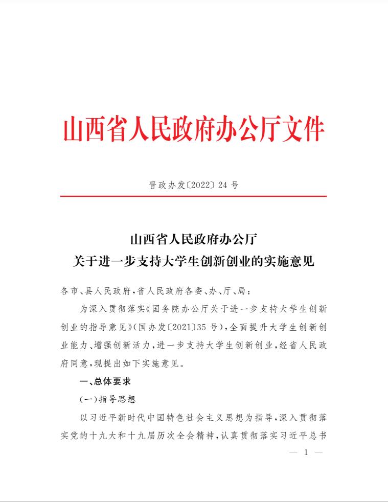山西省人民政府办公厅 关于进一步支持大学生创新创业的实施意见