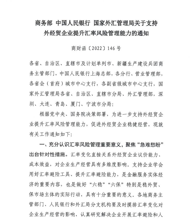 商务部 中国人民银行 国家外汇管理局落实推动外贸保稳提质意见 印发《关于支持外经贸企业提升汇率风险管理能力的通知》